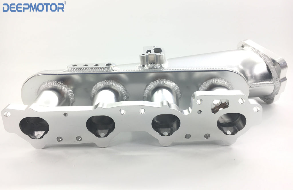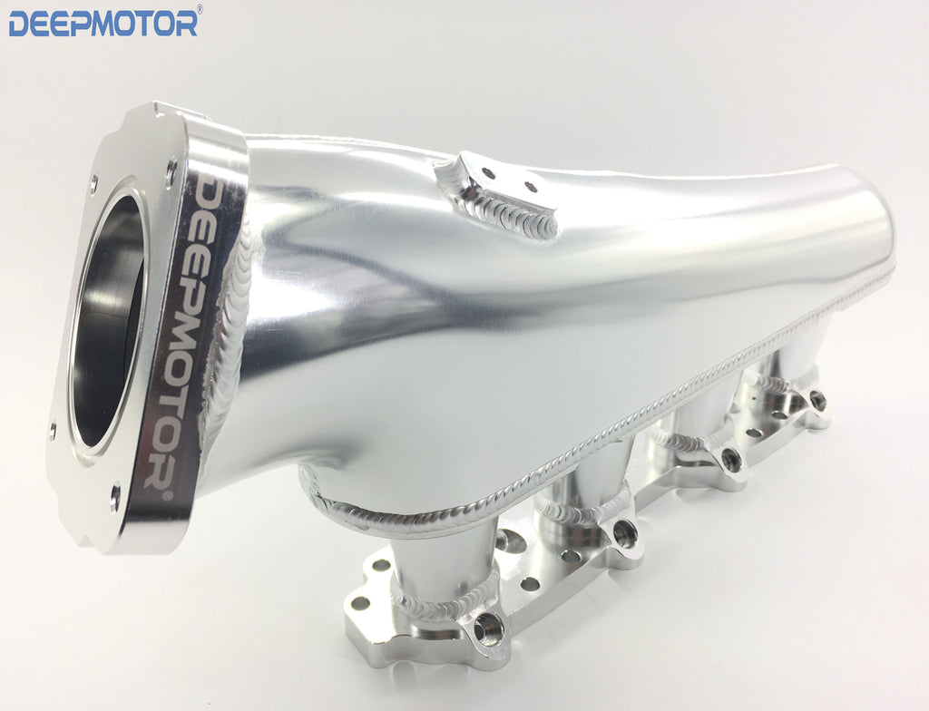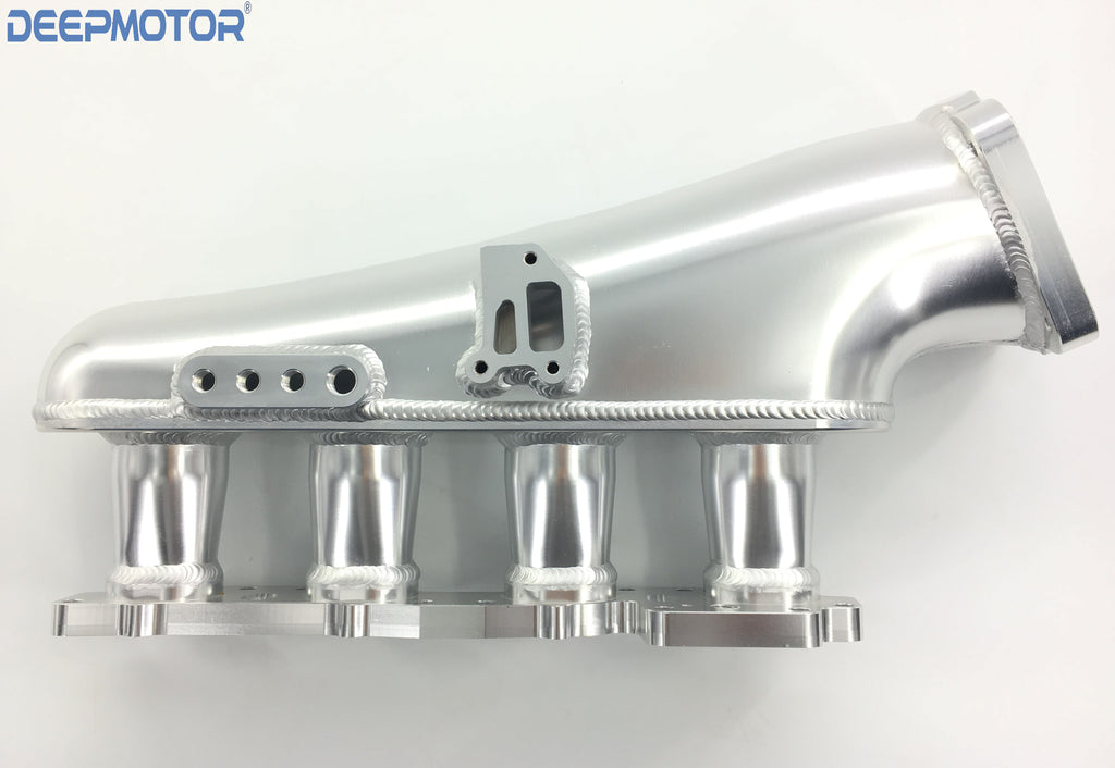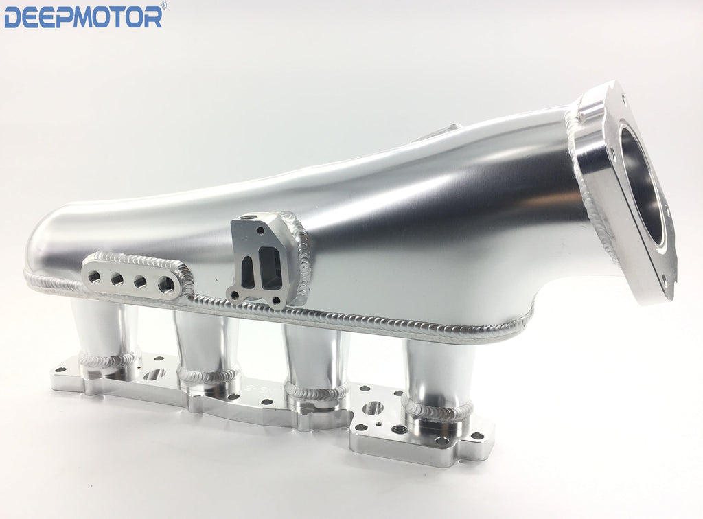 This intake manifold will vastly increase your mid range and top end power, especially for those with upgraded turbo's and camshafts. Each intake runner has a velocity stacks for optimal air flow. This Combo kit includes a billet gold anodized top feed fuel rail with 8AN inlet and outlet and a billet 76mm throttle body. The intake has provisions for OEM IAC and includes an IAC delete plate making this intake manifold good for both street and track use. With it's fully TIG welded runners and high polished finish the ISR intake manifold is a visual compliment to any engine bay.