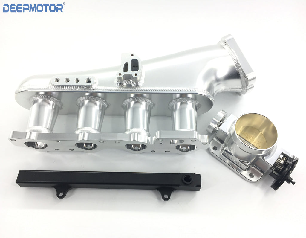 • This intake manifold will vastly increase your mid range and top end power, especially for those with upgraded turbo's and camshafts. Each intake runner has a velocity stacks for optimal air flow. This Combo kit includes a billet gold anodized top feed fuel rail with 8AN inlet and outlet and a billet 76mm throttle body. The intake has provisions for OEM IAC and includes an IAC delete plate making this intake manifold good for both street and track use. With it's fully TIG welded runners and high polished finish the ISR intake manifold is a visual compliment to any engine bay.
